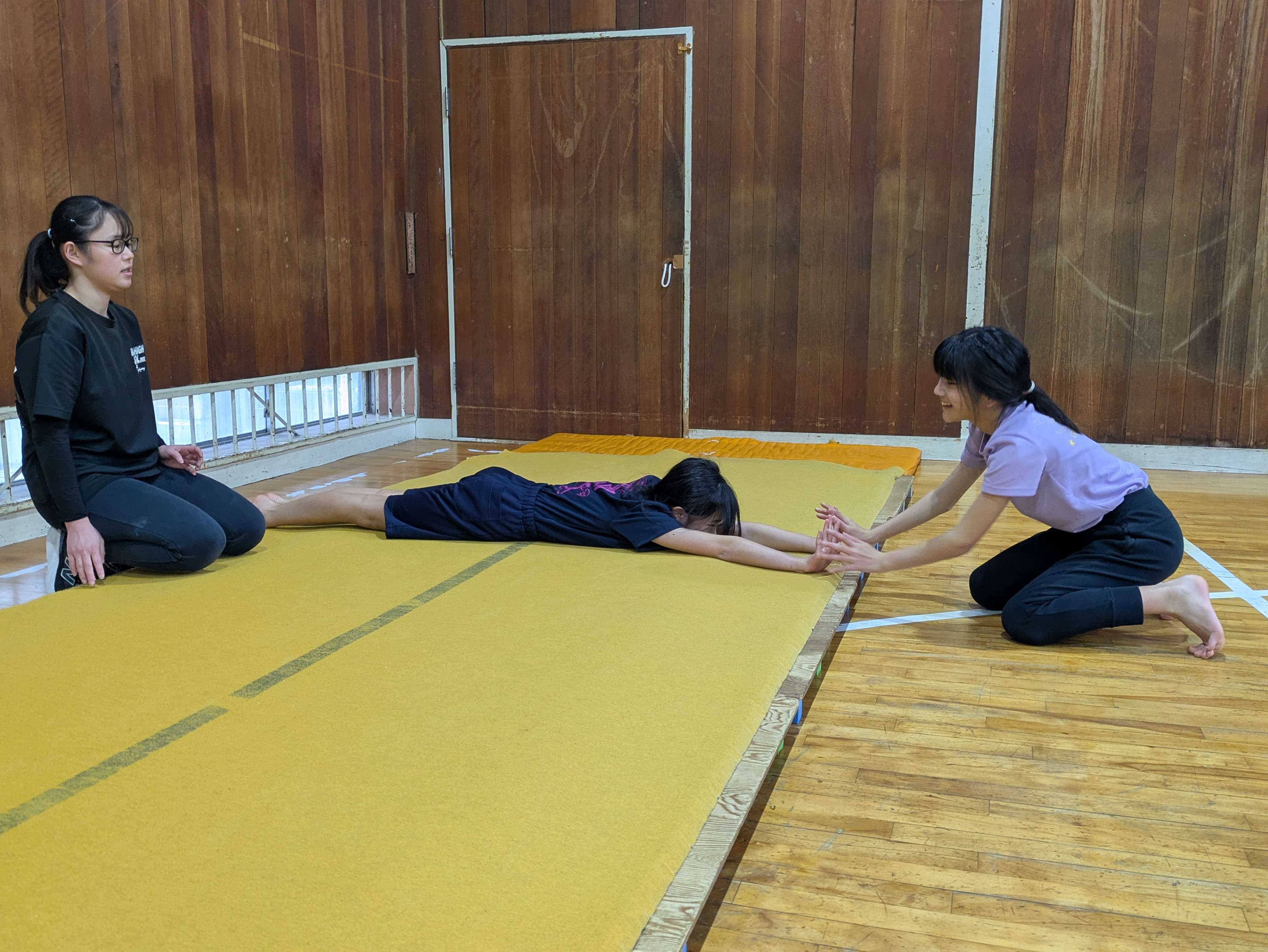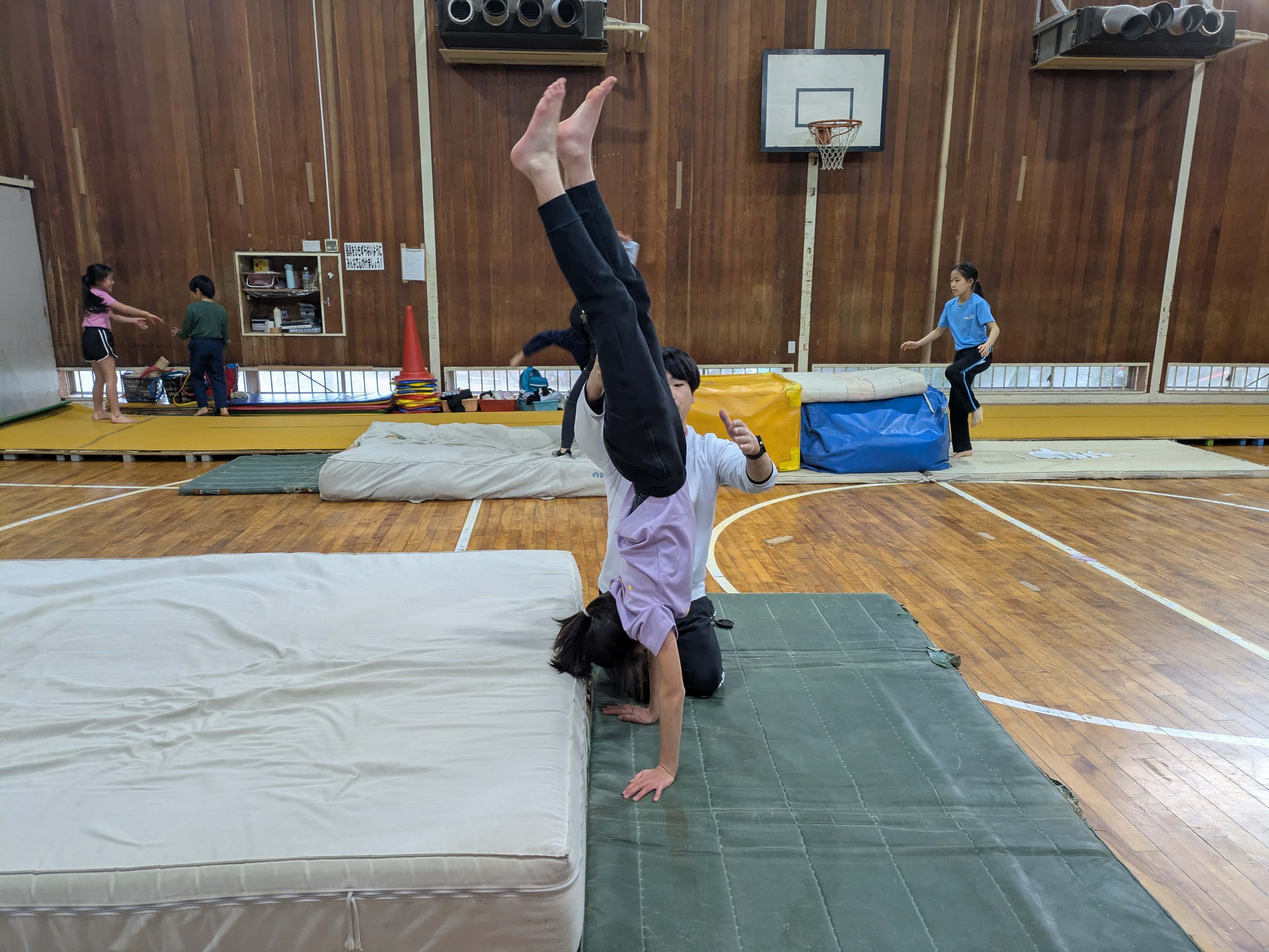はじめに、倒立姿勢の確認をしました。寝転んで体に力が入っているか確認をしたり、手で押す感覚を確認したりしました!