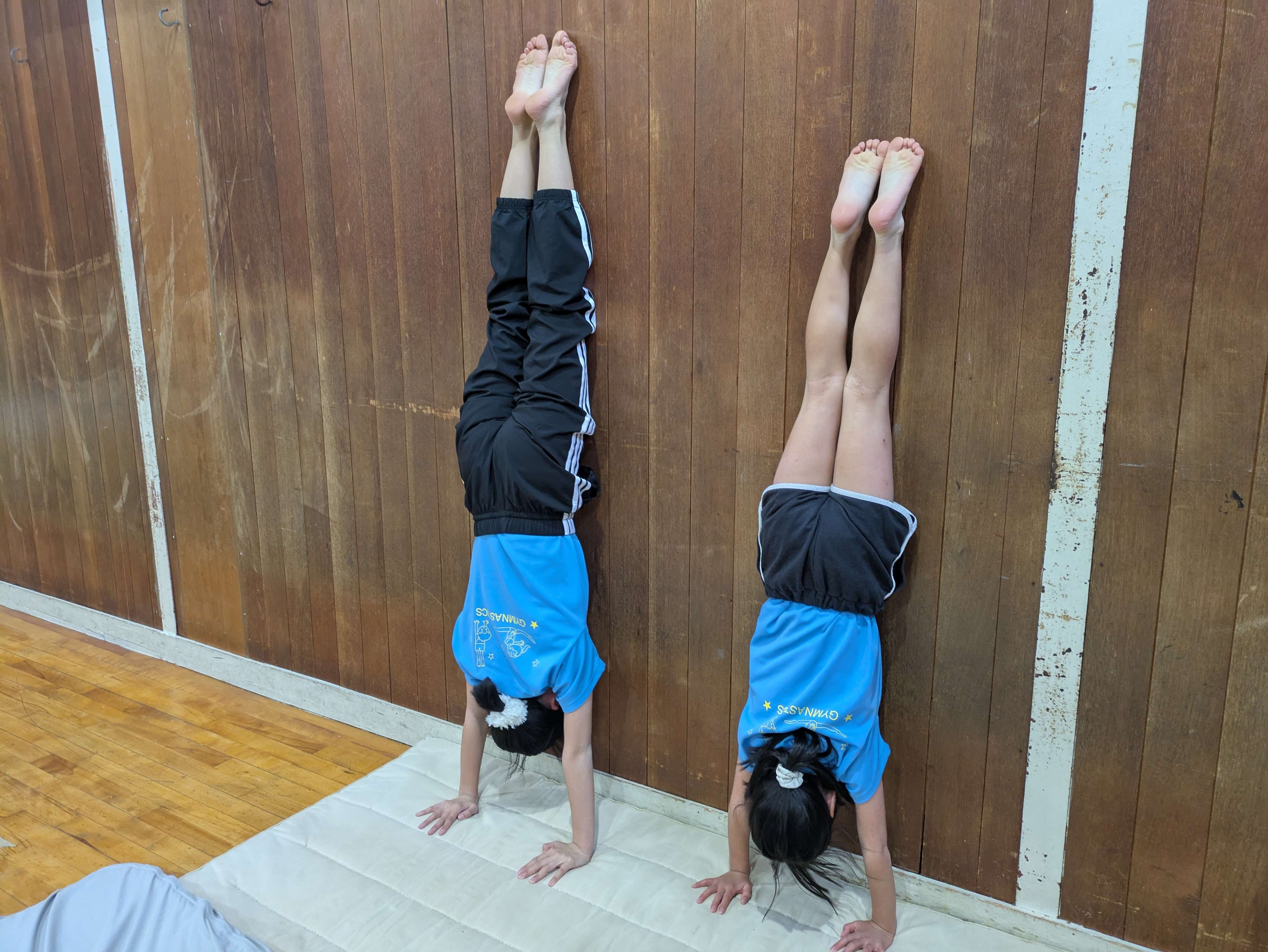 2分間トレーニングでは、倒立姿勢を意識して、壁倒立や倒立パタンをしました。
