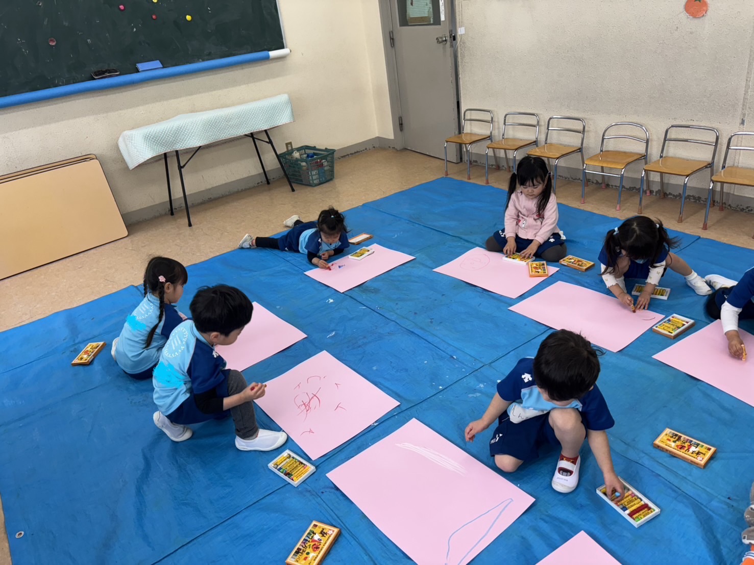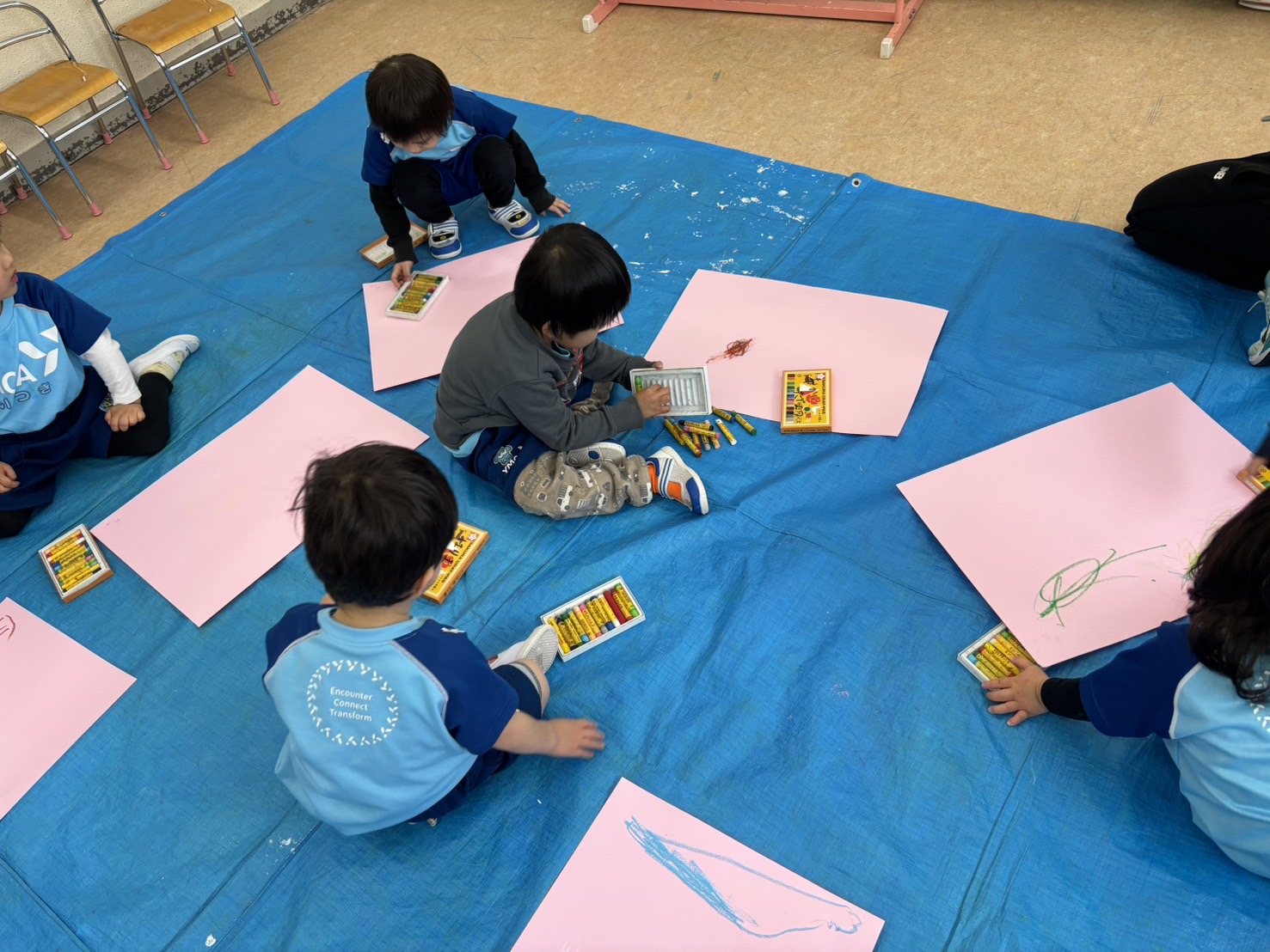 お部屋では自由画を描いています。字のようなものを描いたり、物語が広がっていたり、子どもたちの中でただ絵を描いているだけではなくなってきました。絵1つとっても、成長が分かりますね。まとめて一年分お渡ししますので、さかのぼって比べてみてくださいね(^^♪