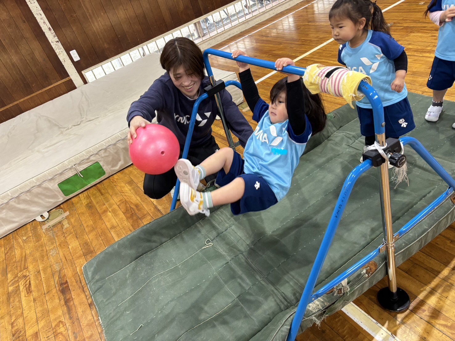サーキットの鉄棒では、両足でボールをキックしてもらいました。みんなググっと上手に足が持ち上がっています。逆上がりへの第一歩ですね!