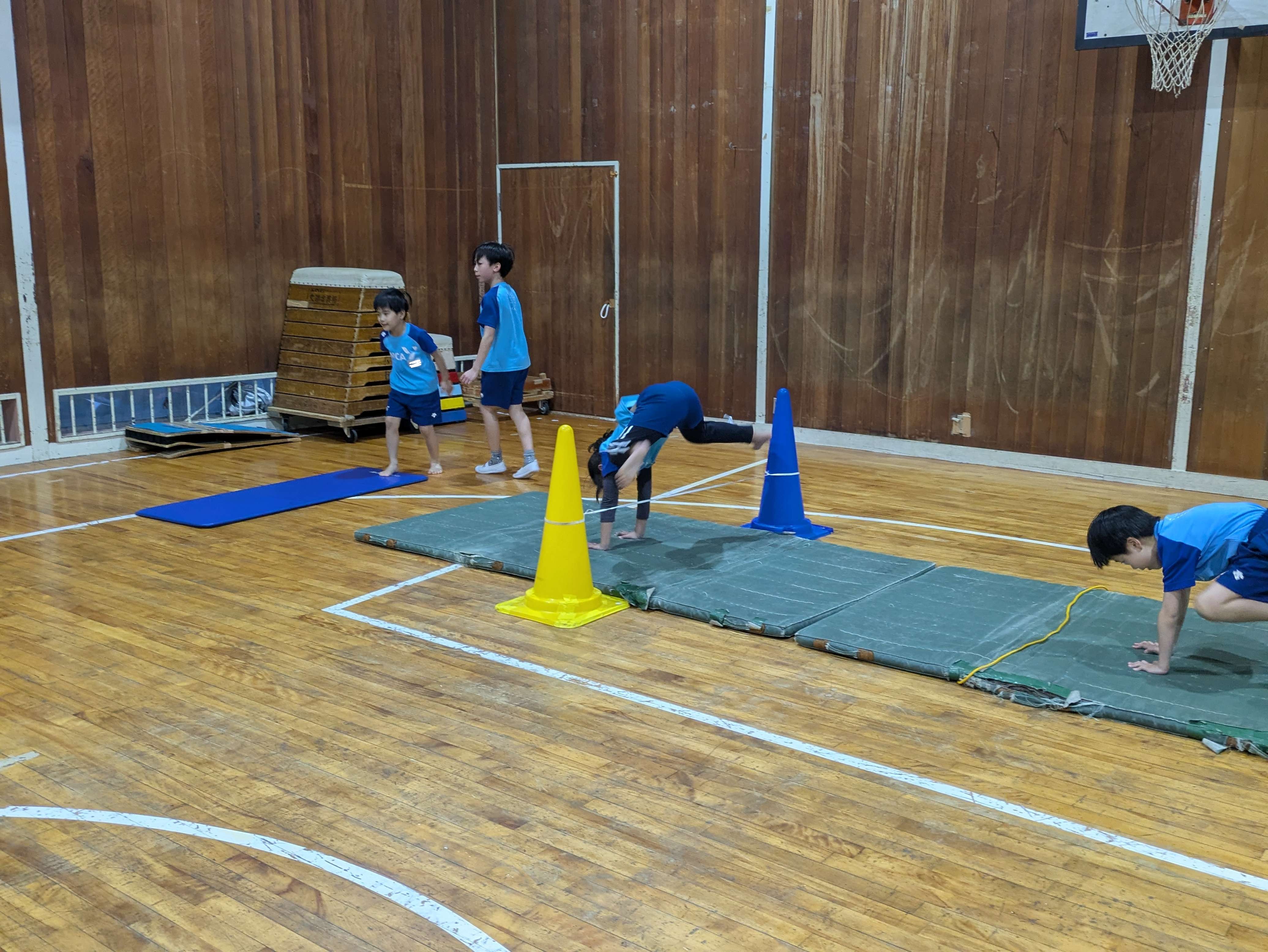 マットでは、体を伸ばして側転や倒立ができるように頑張りましょう!