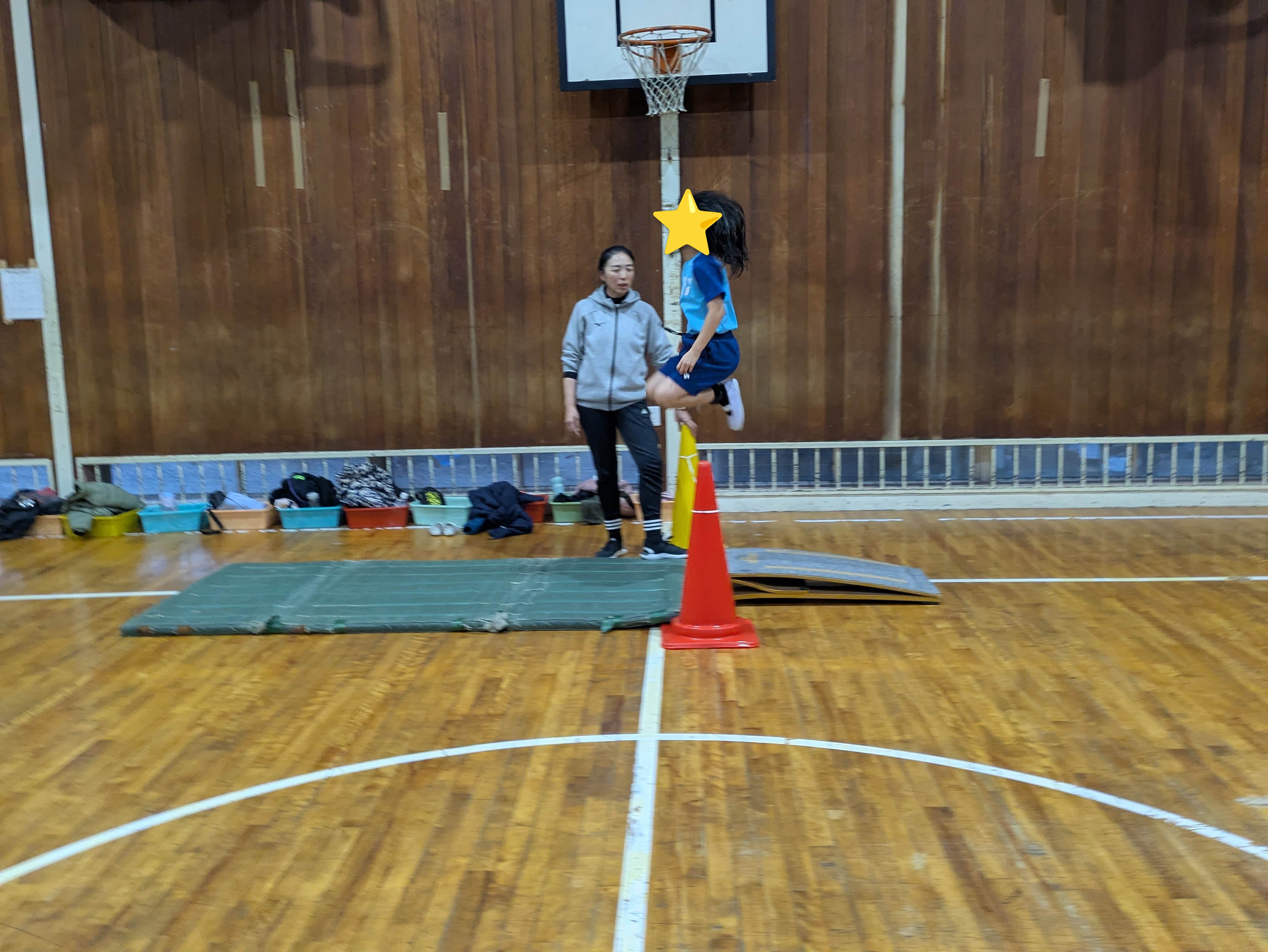 ロイター板でのジャンプの仕方の確認や、体を前に運ぶ練習をしました!