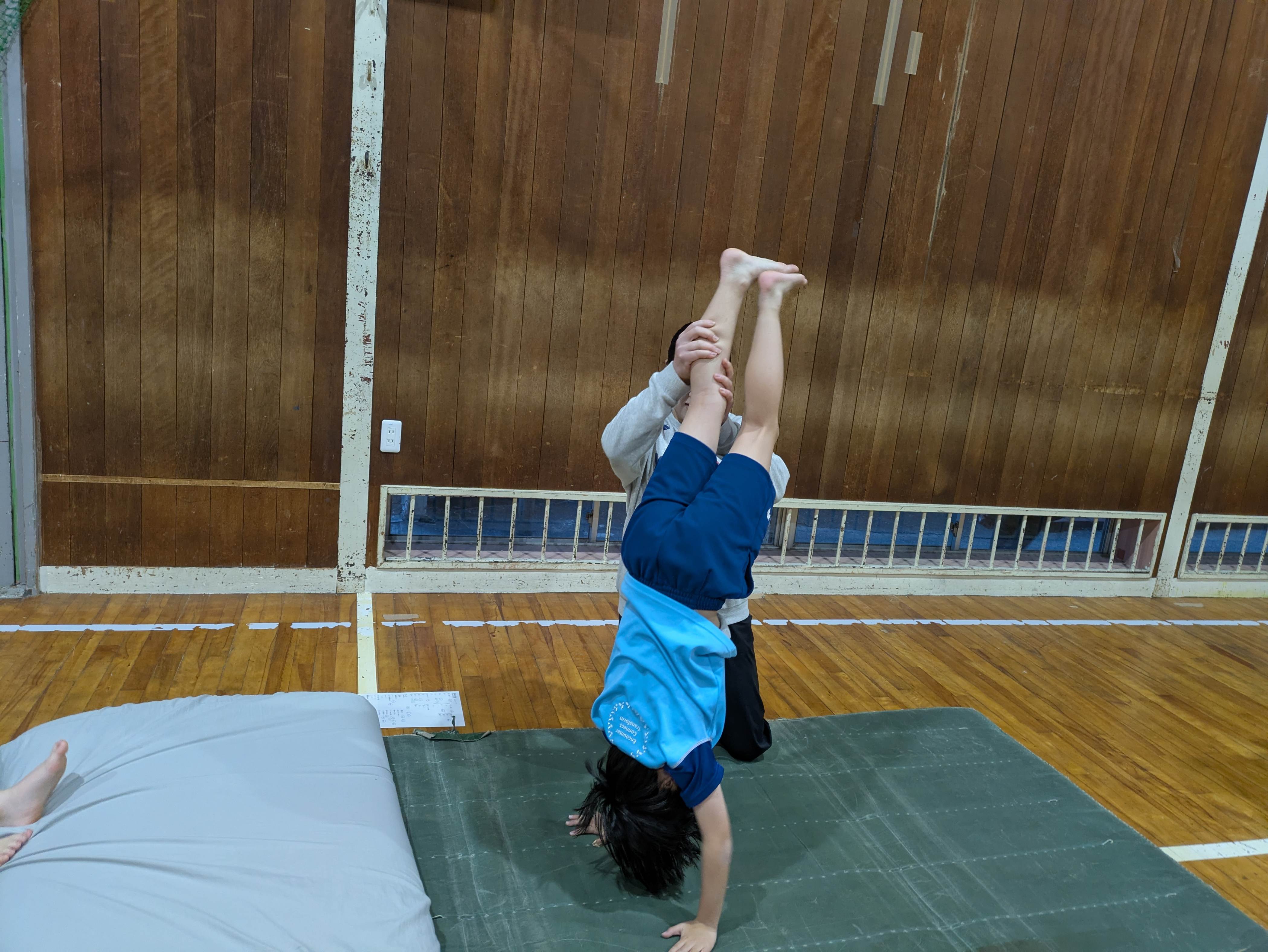 マットの倒立は、背中が丸くなりがちなので、姿勢よくできるように頑張りましょう!