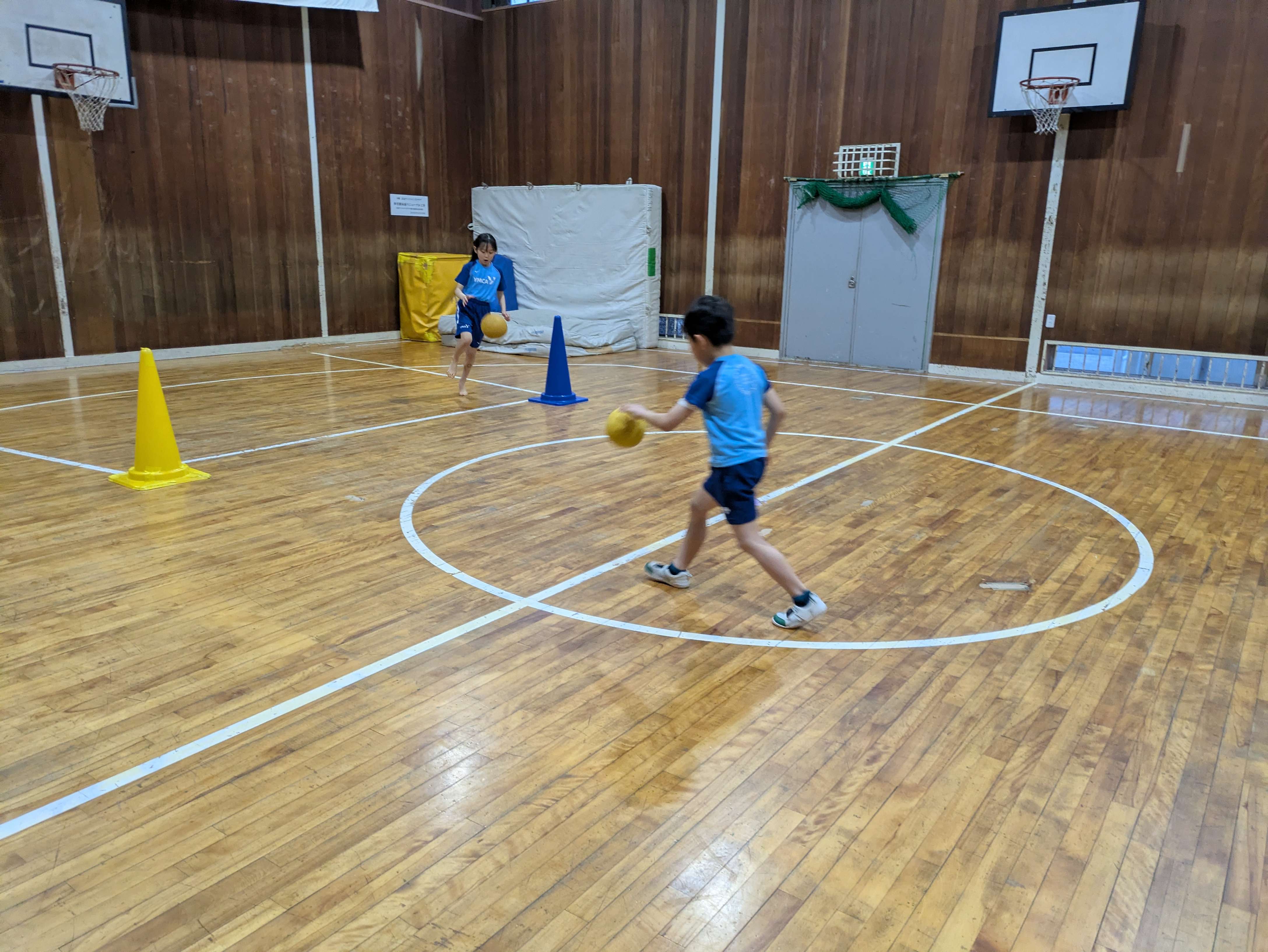 歩きながら投げてキャッチや、スキップやギャロップをしながらドリブルをしました。