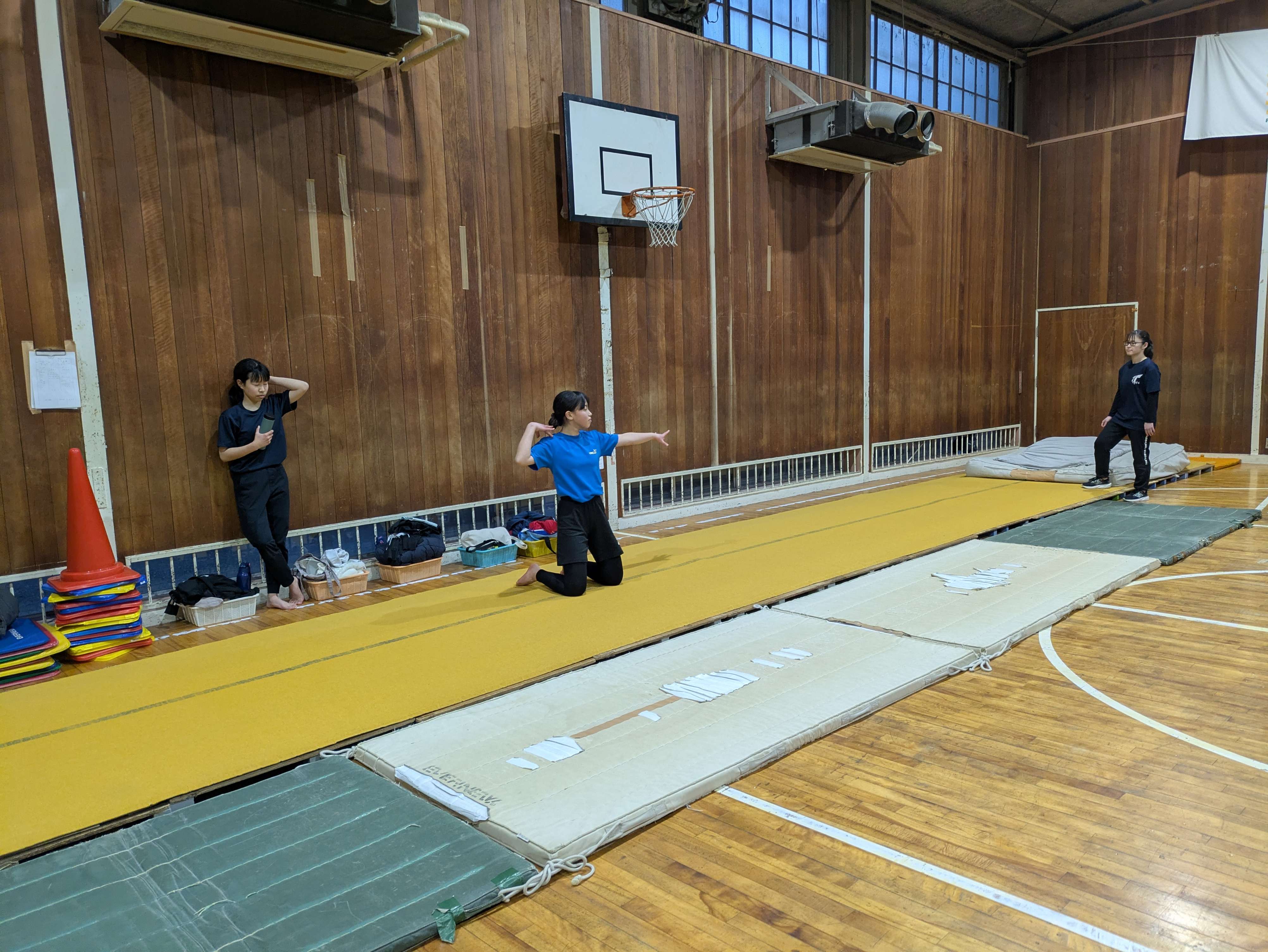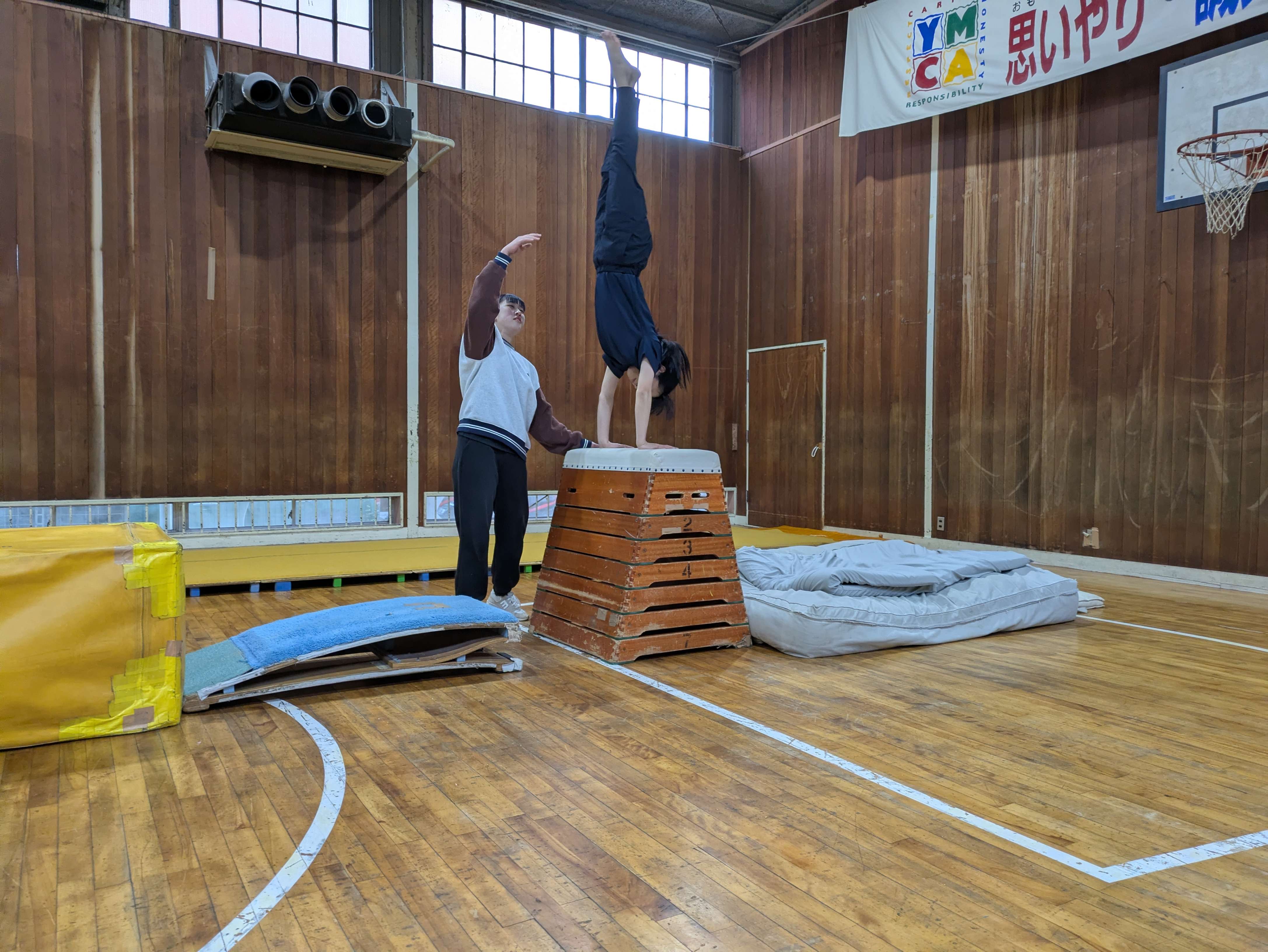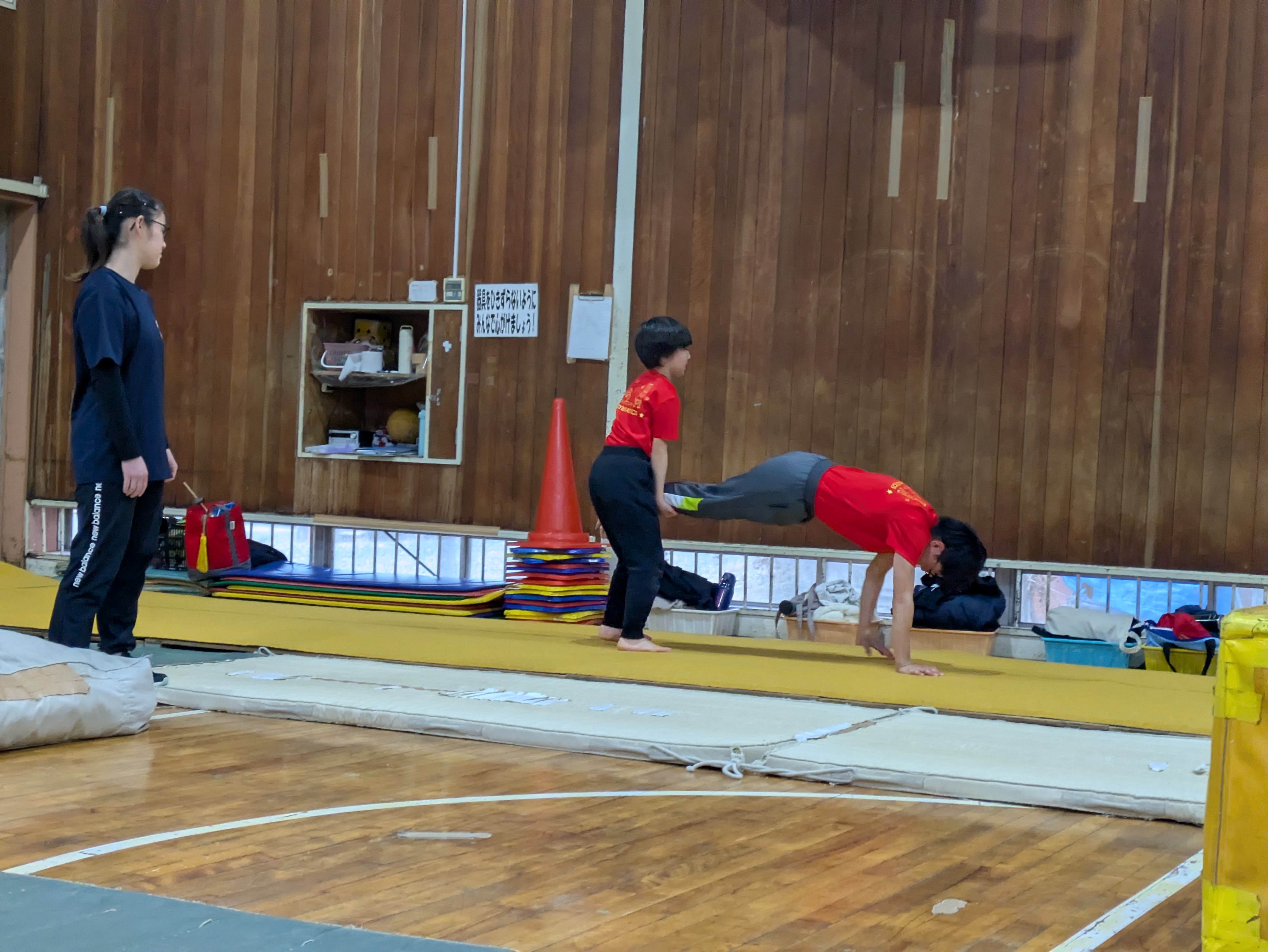 トレーニングでは、振り上げ倒立や手押し車などをしました。どこに力を入れるとしっかり体が締まるのか、意識して取り組みましょう!