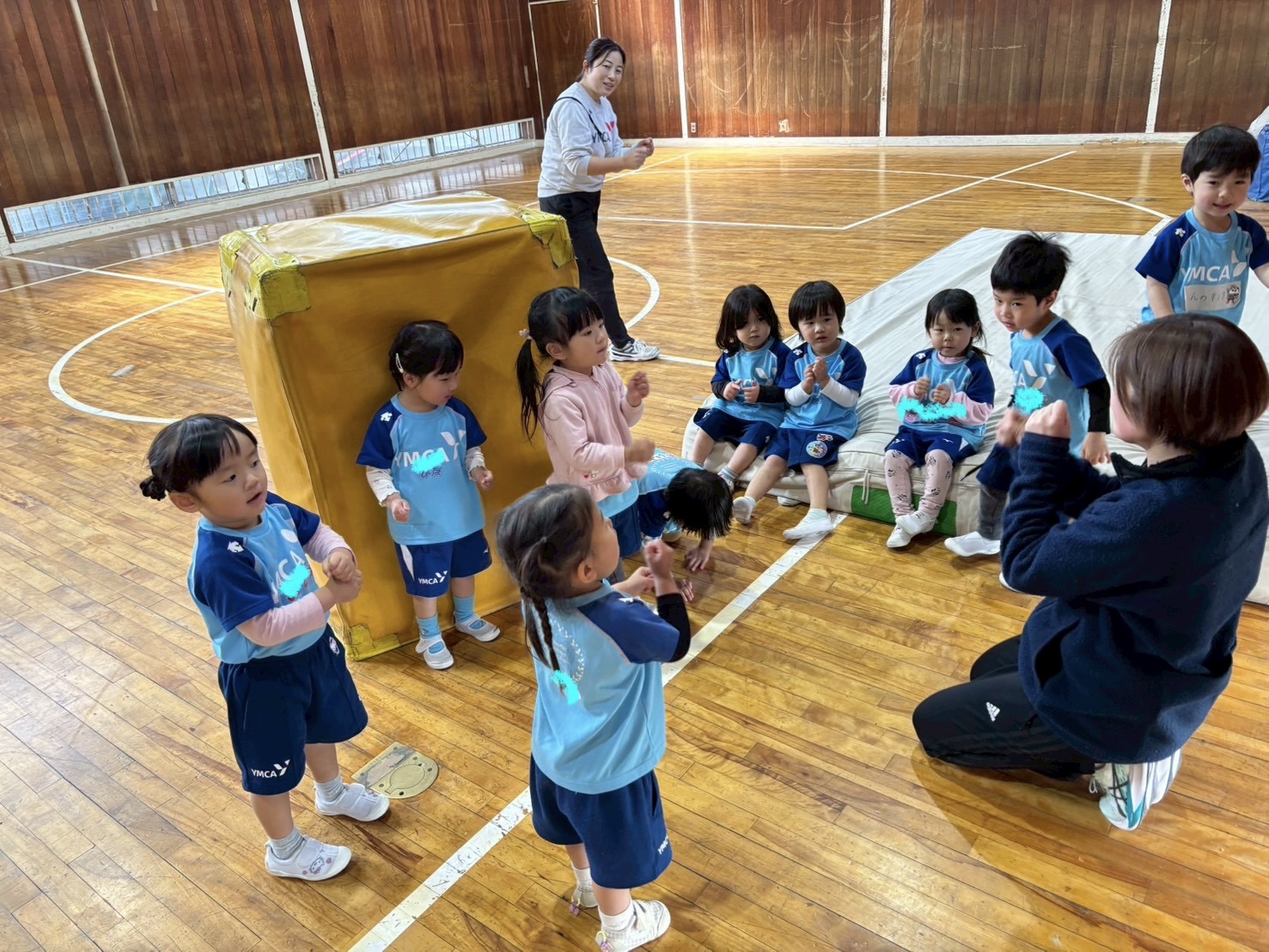 「チョコリーダーの所に集まれ〜!」号令をかけるとあっという間に集まりました。それぞれのリーダーと手遊びを楽しんだね!