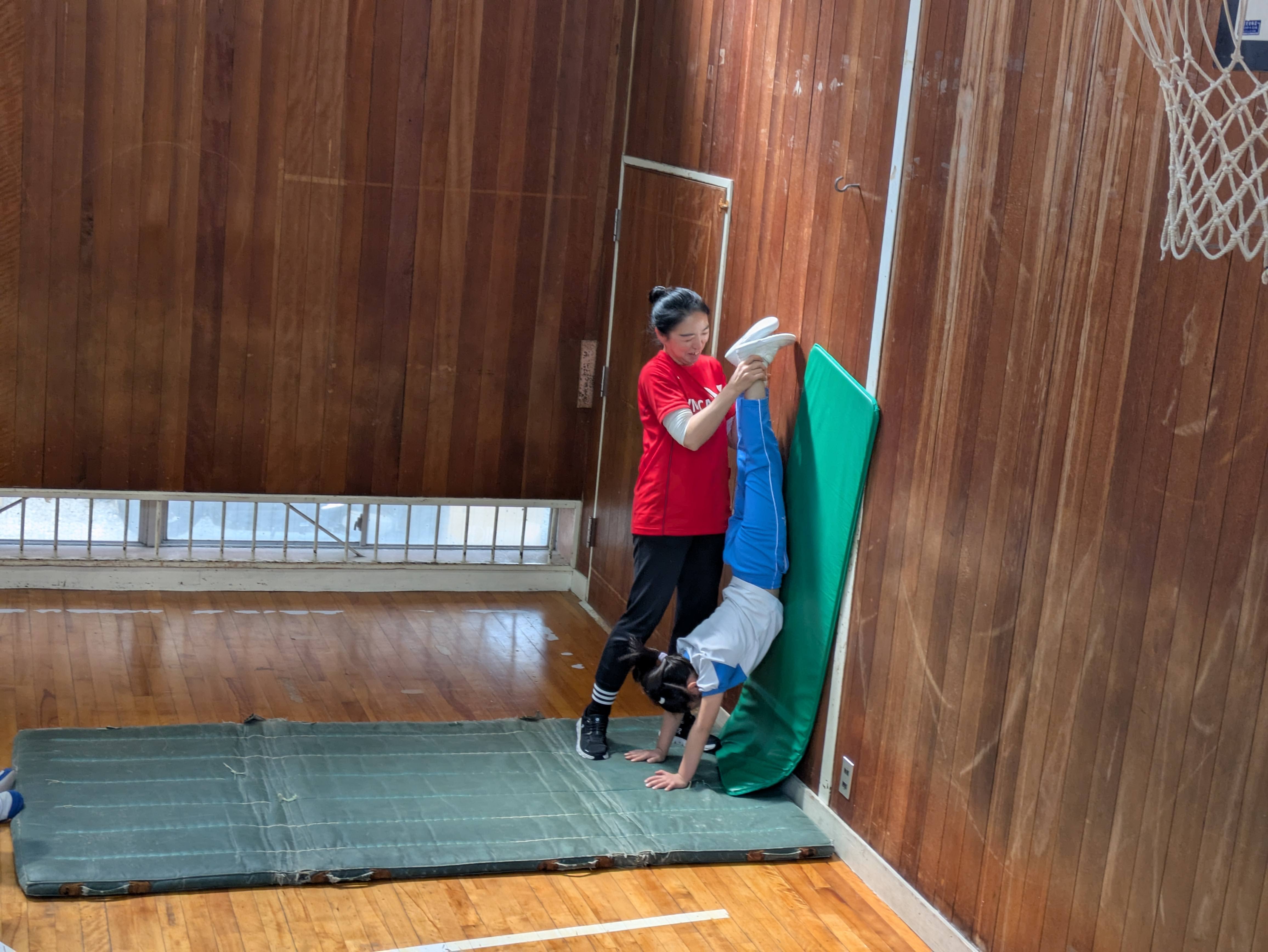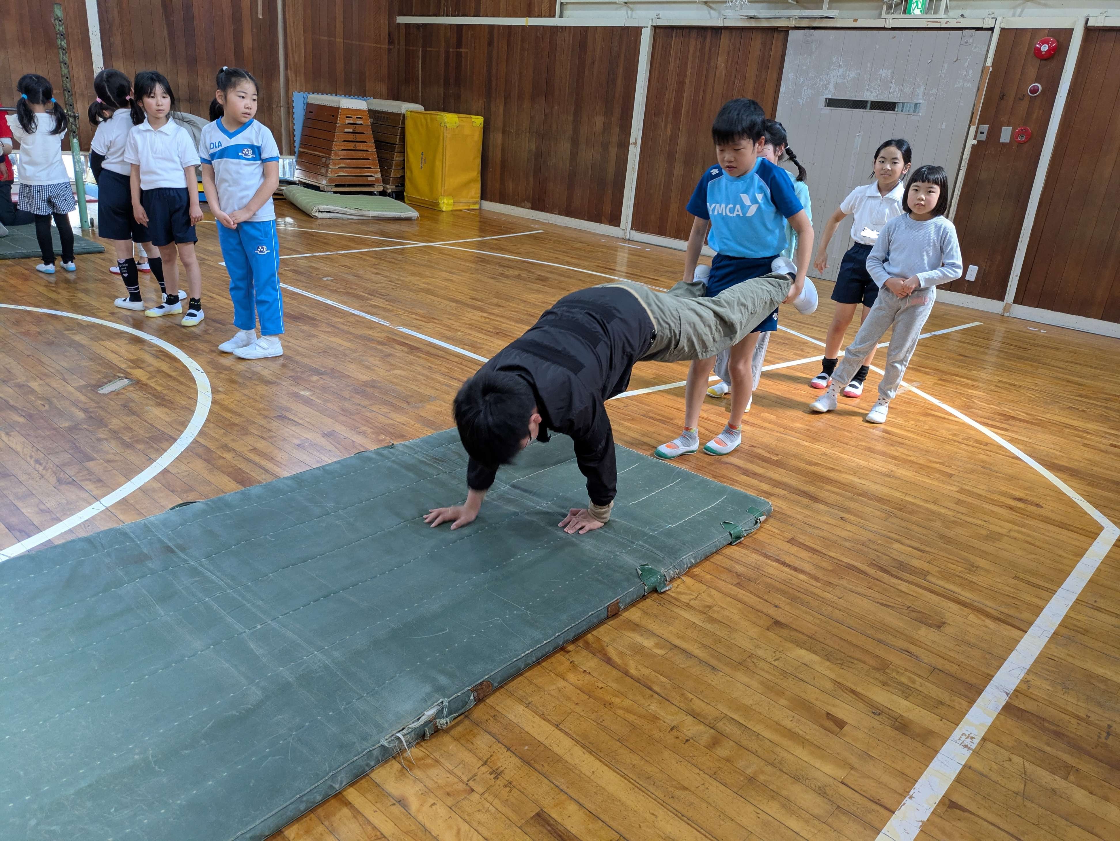 マットでは、手押し車や壁倒立など、しっかり腕で自分の体重を支えられましたね!次は、体を反らないようにまっすぐできるように頑張りましょうね!