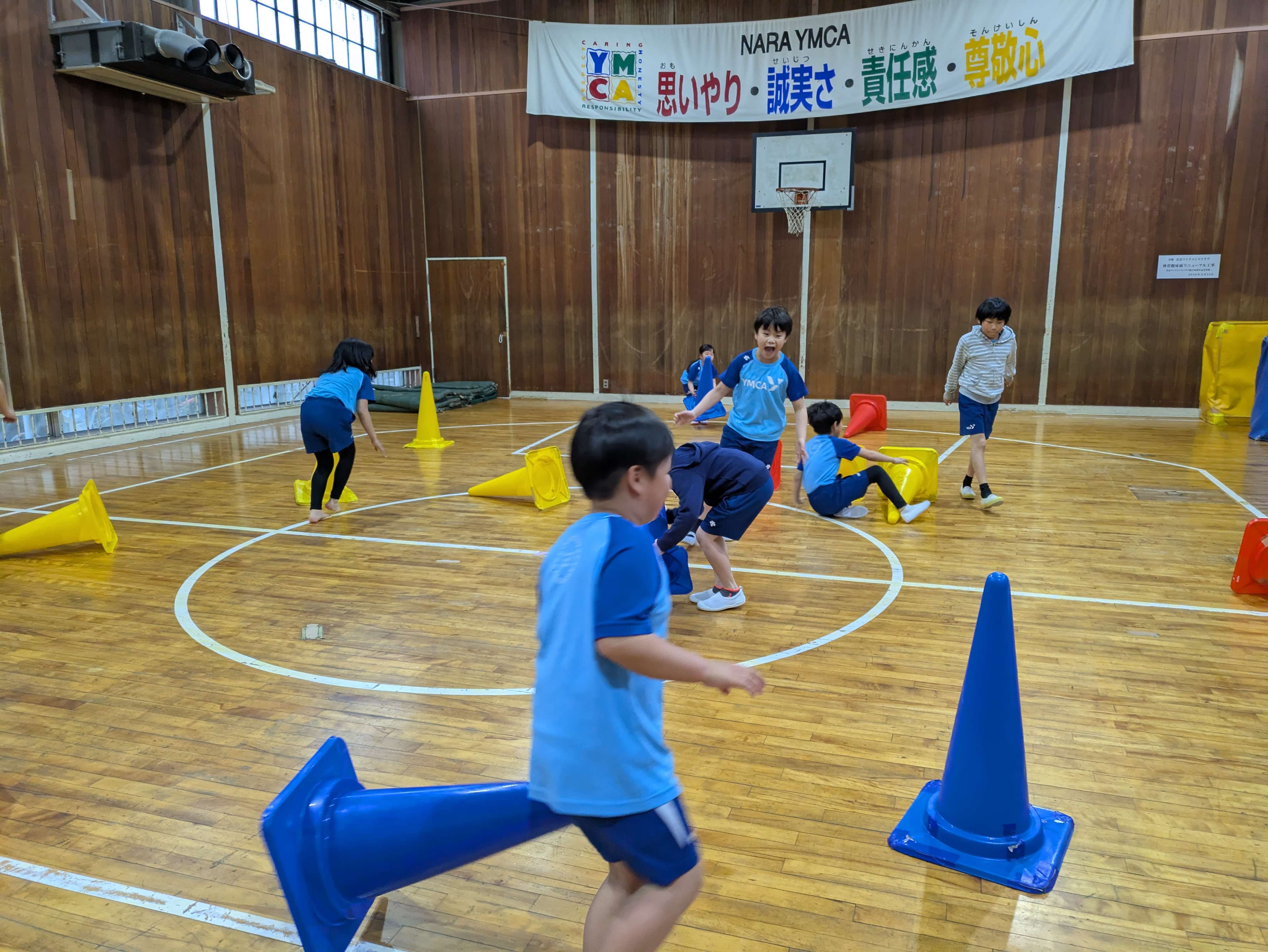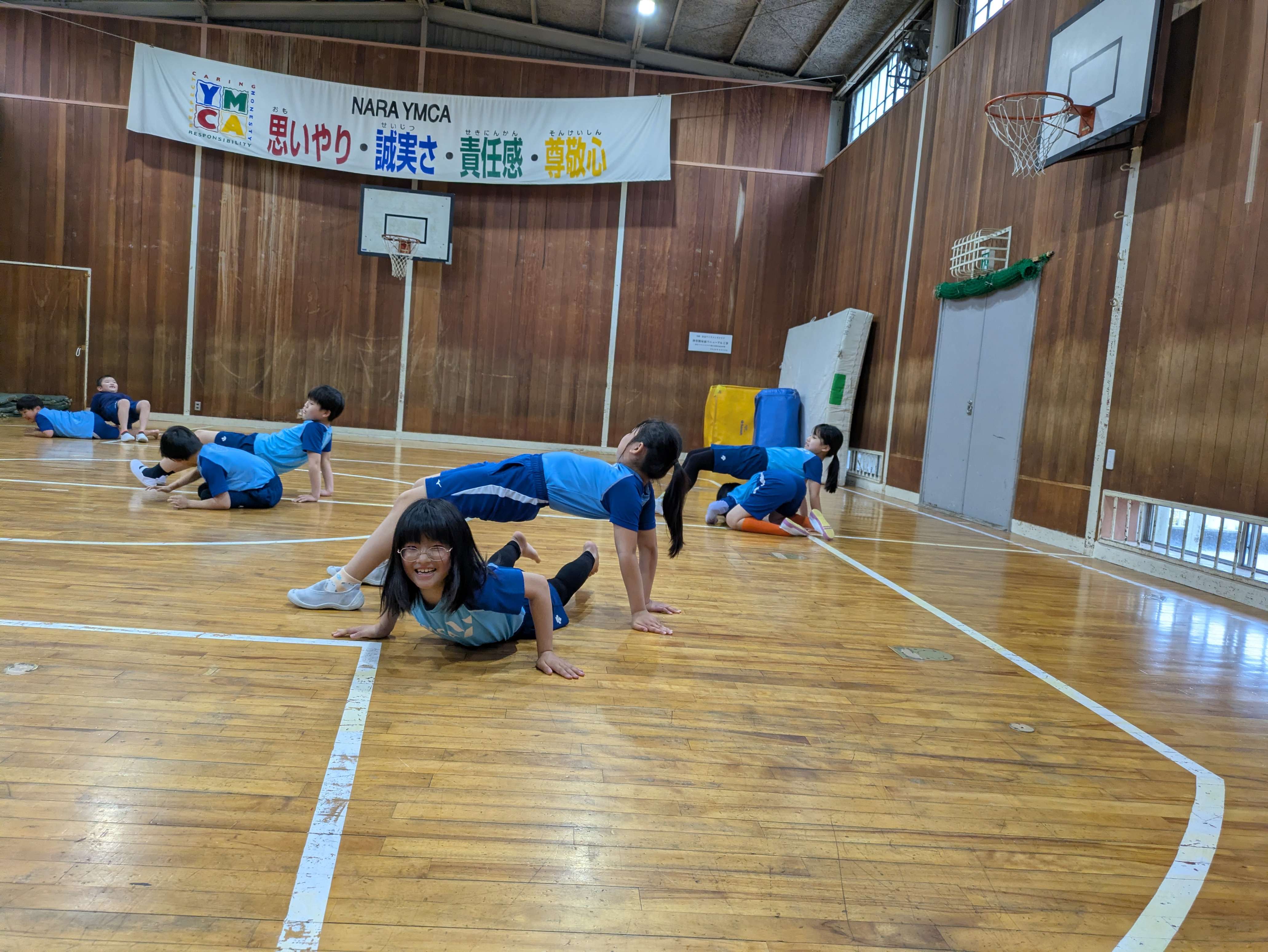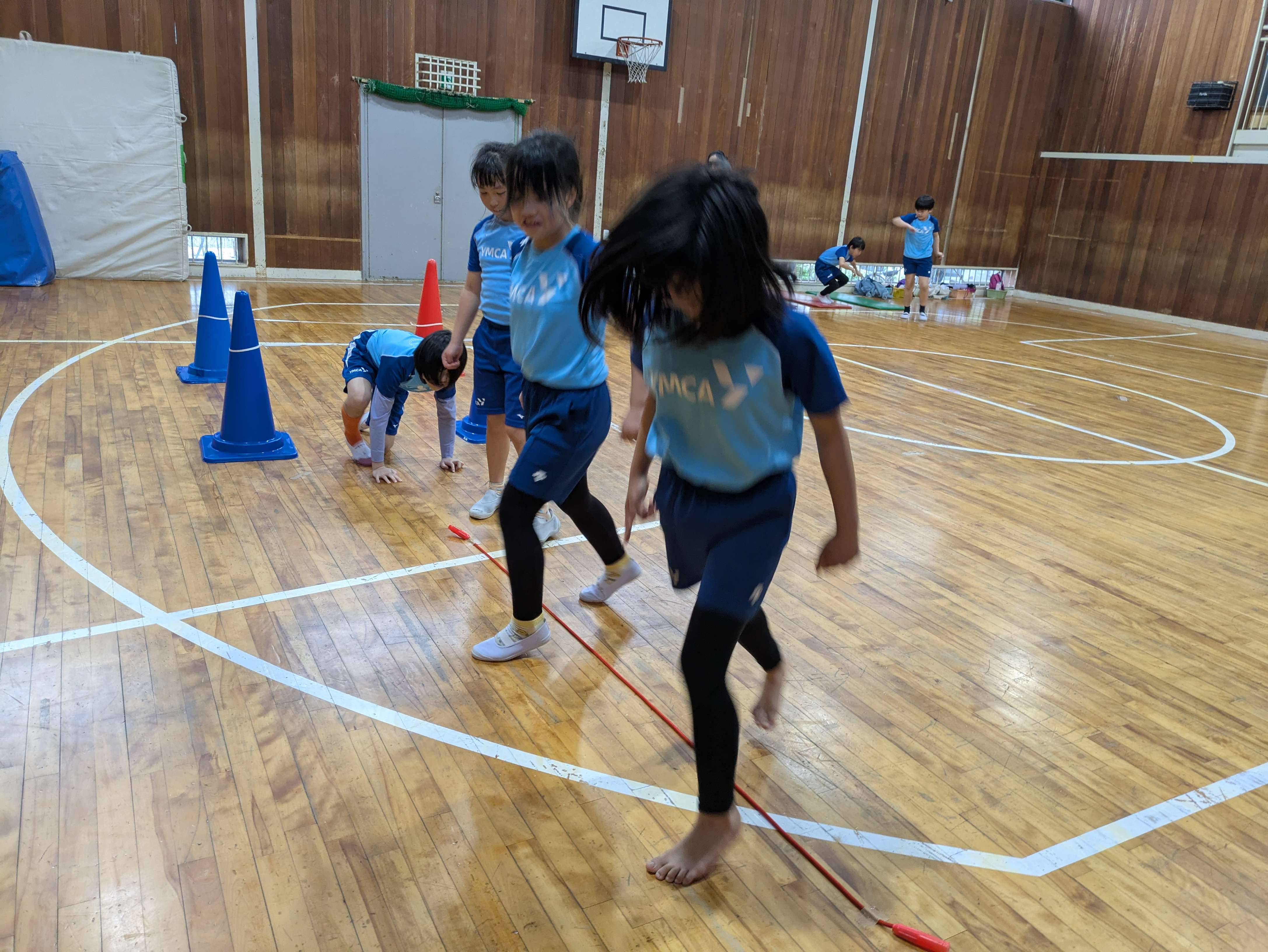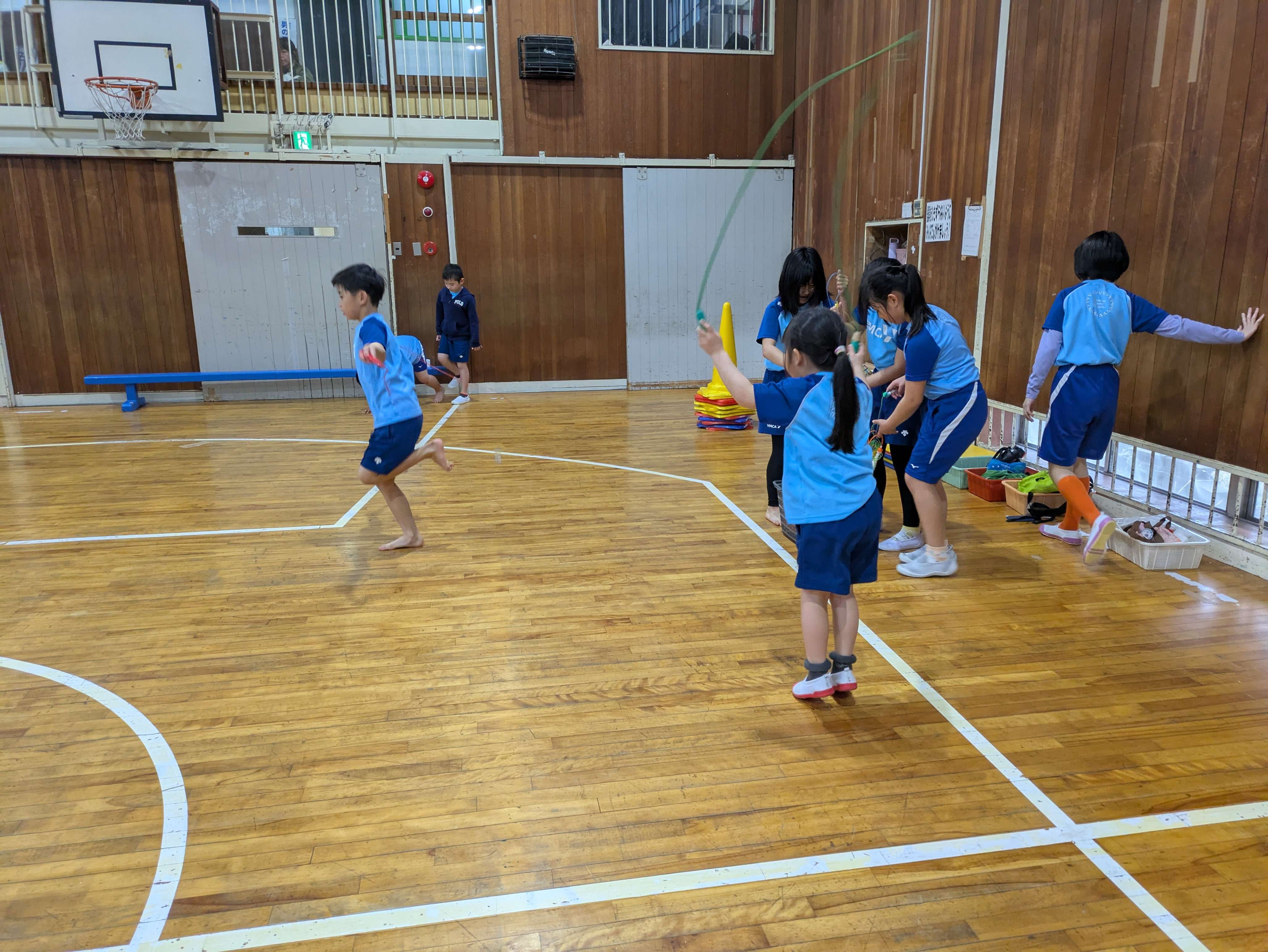 はじめに、2人組でジャンプをしたり、お友だちの下をくぐったりしました!