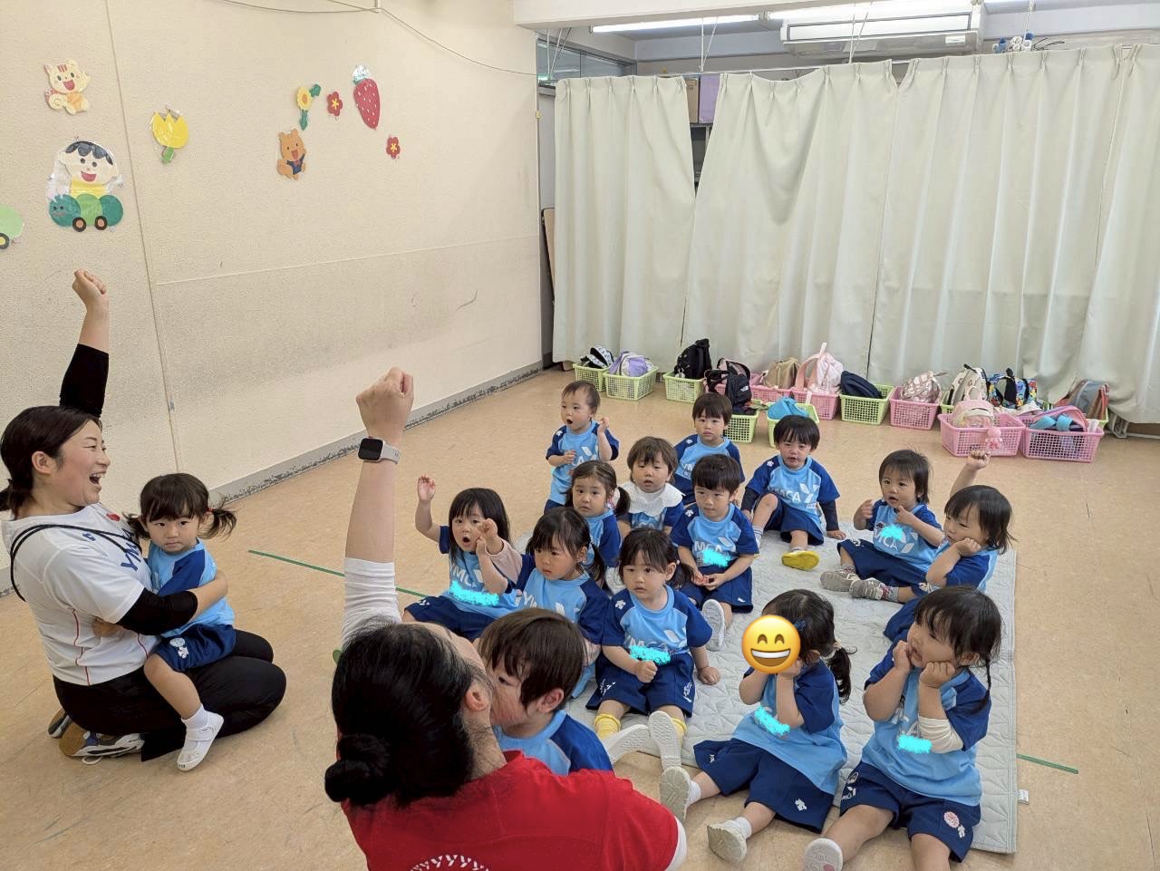 朝のご挨拶の前のタイミングの様子です。お母さんたちと離れて10分後くらいかなと思います。みんな上手に座って手遊び出来てますね(^_-)-☆