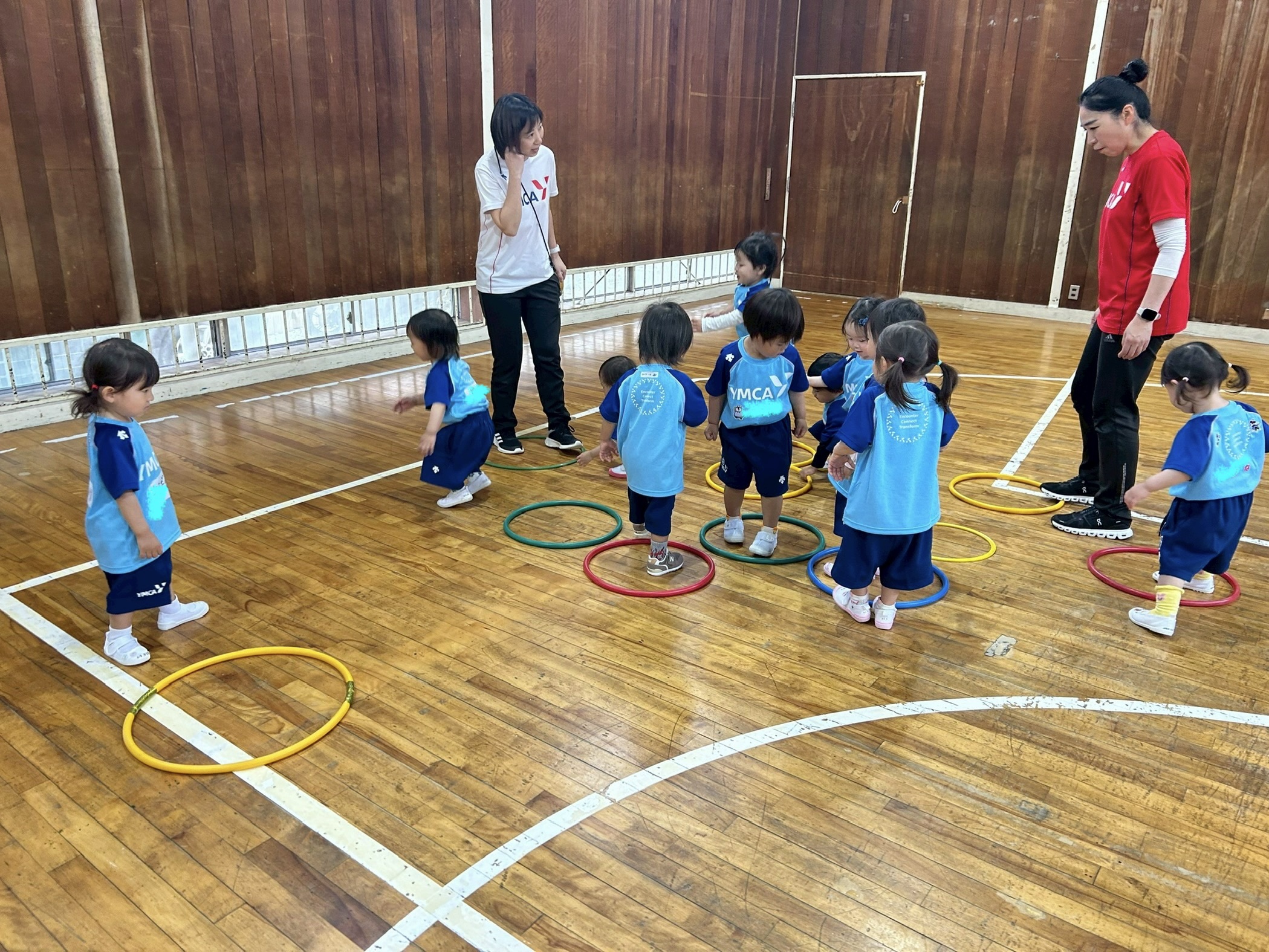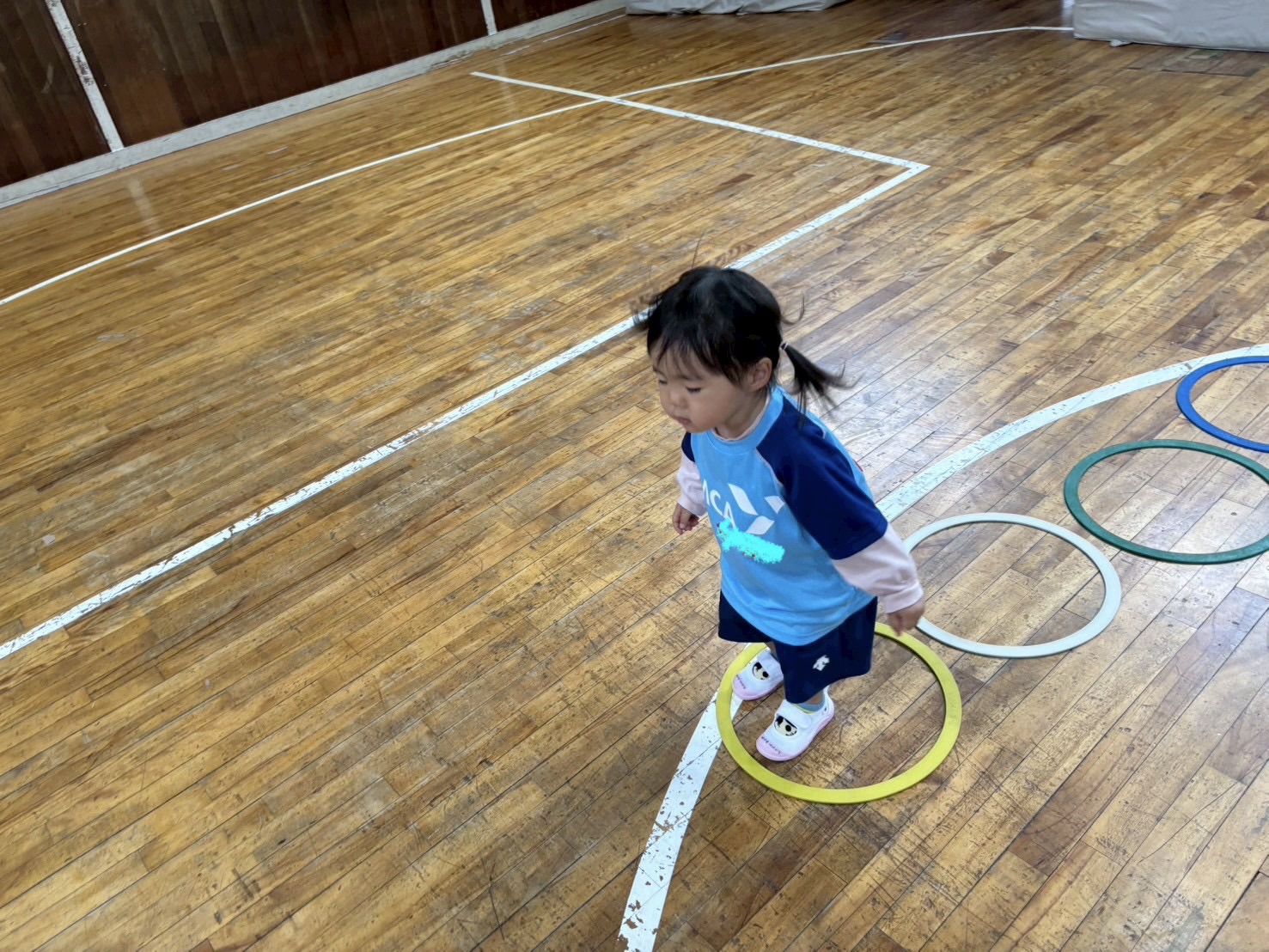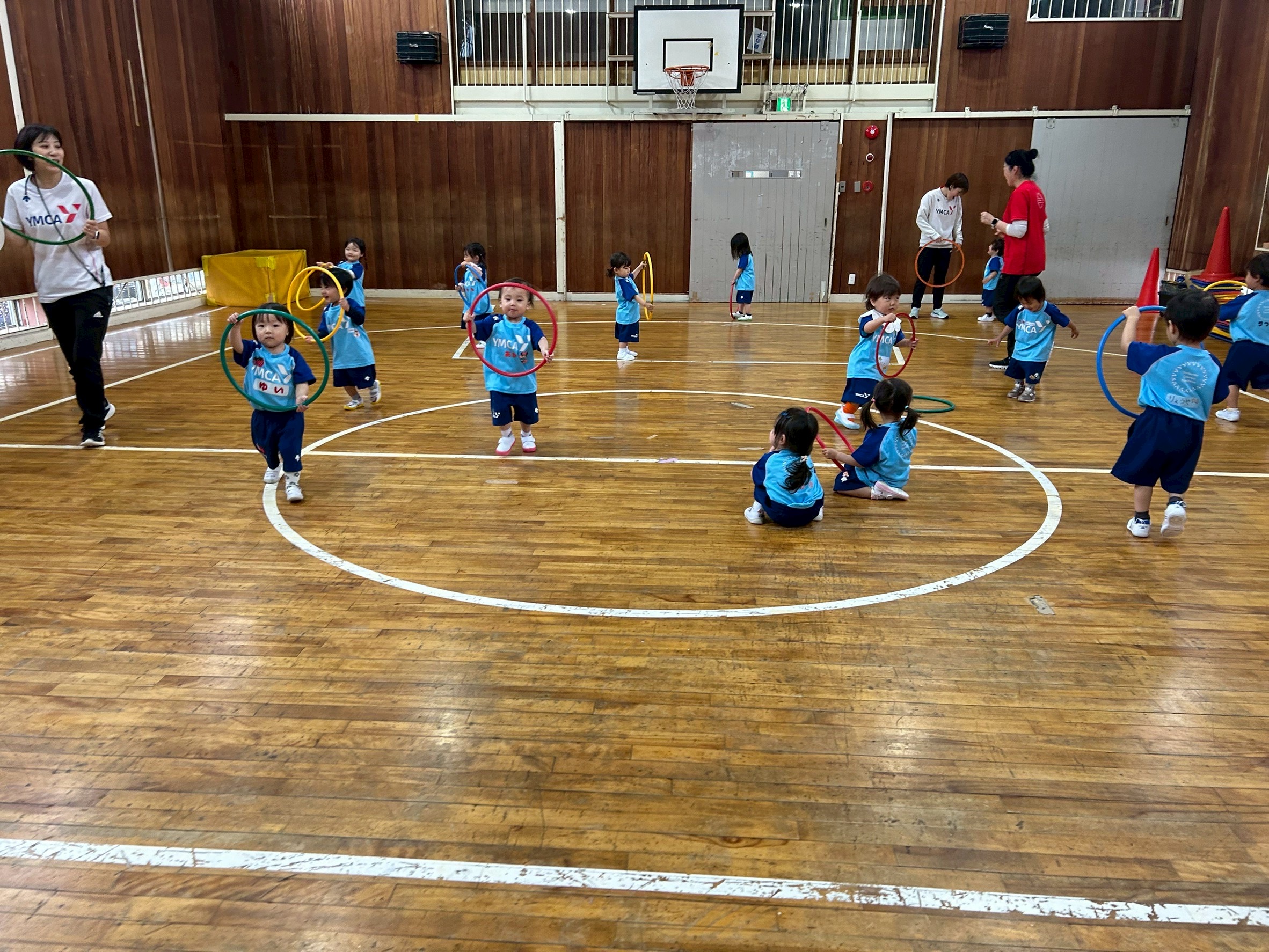 今日はフープを使って遊びました。フープをハンドルに変身させて体育館をぐるっと走ります。その後リーダーの合図でまねっこをしてもらいました。