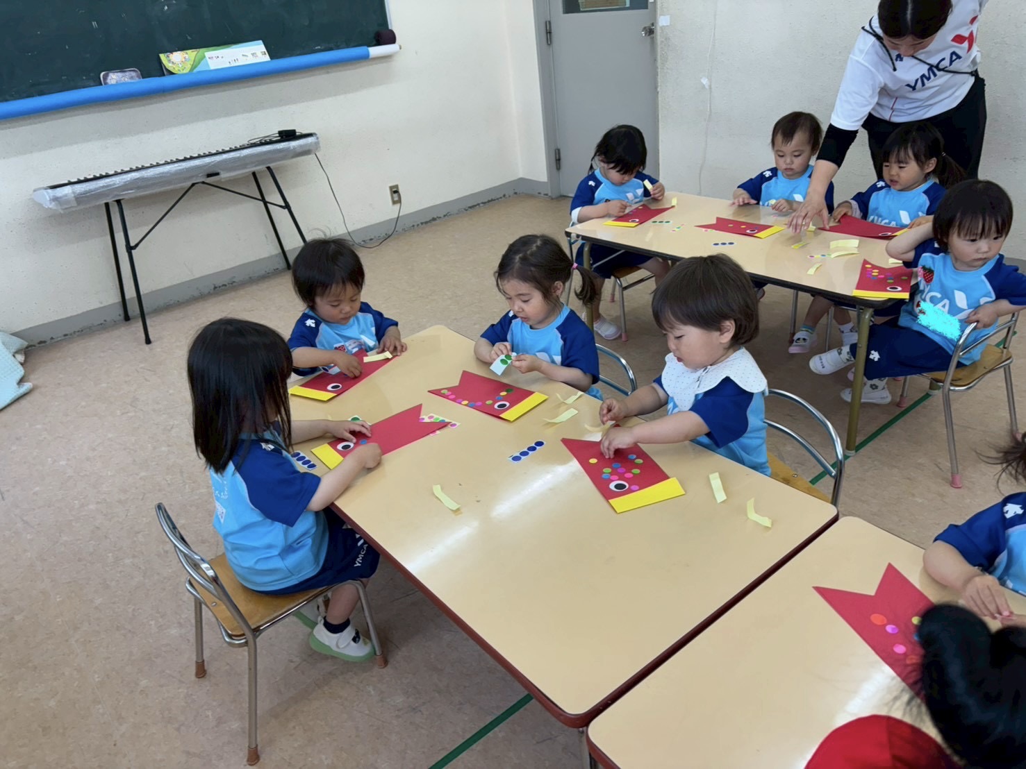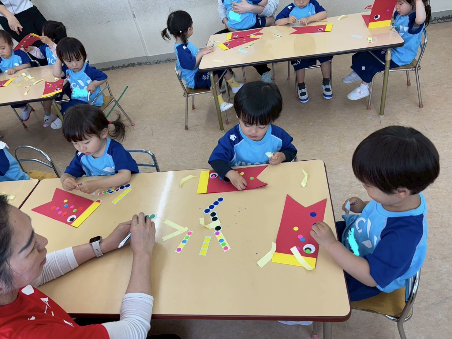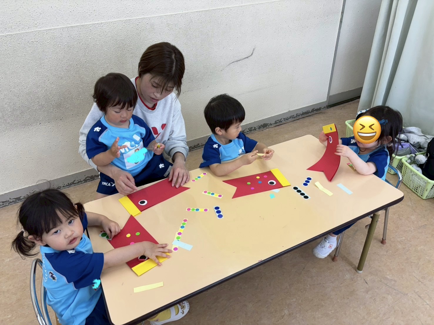 お部屋ではこいのぼりの政策をしています。集中して座ることができました。シールをめくる手も上手だし、とってもかわいい(#^.^#)それぞれこだわりのこいのぼりが出来上がりました!