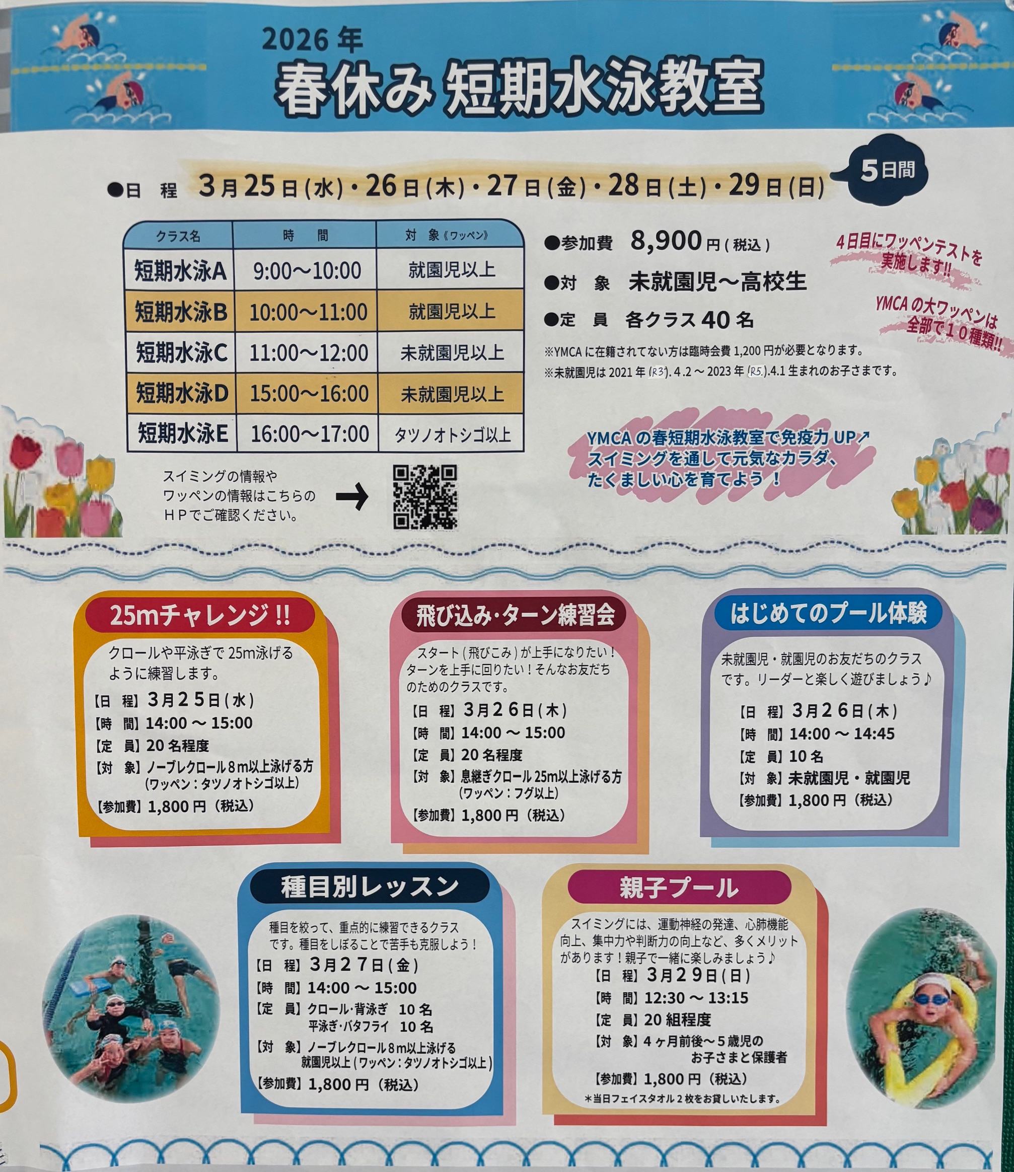 🌟短期水泳教室は、5日間行います。最終日にはワッペン評価があり、ドキドキわくわくですが、5日間頑張ったという証になります。水嫌いやお子様、親子プール、種目別レッスンとバラエティーに富んだコースを設定しています。