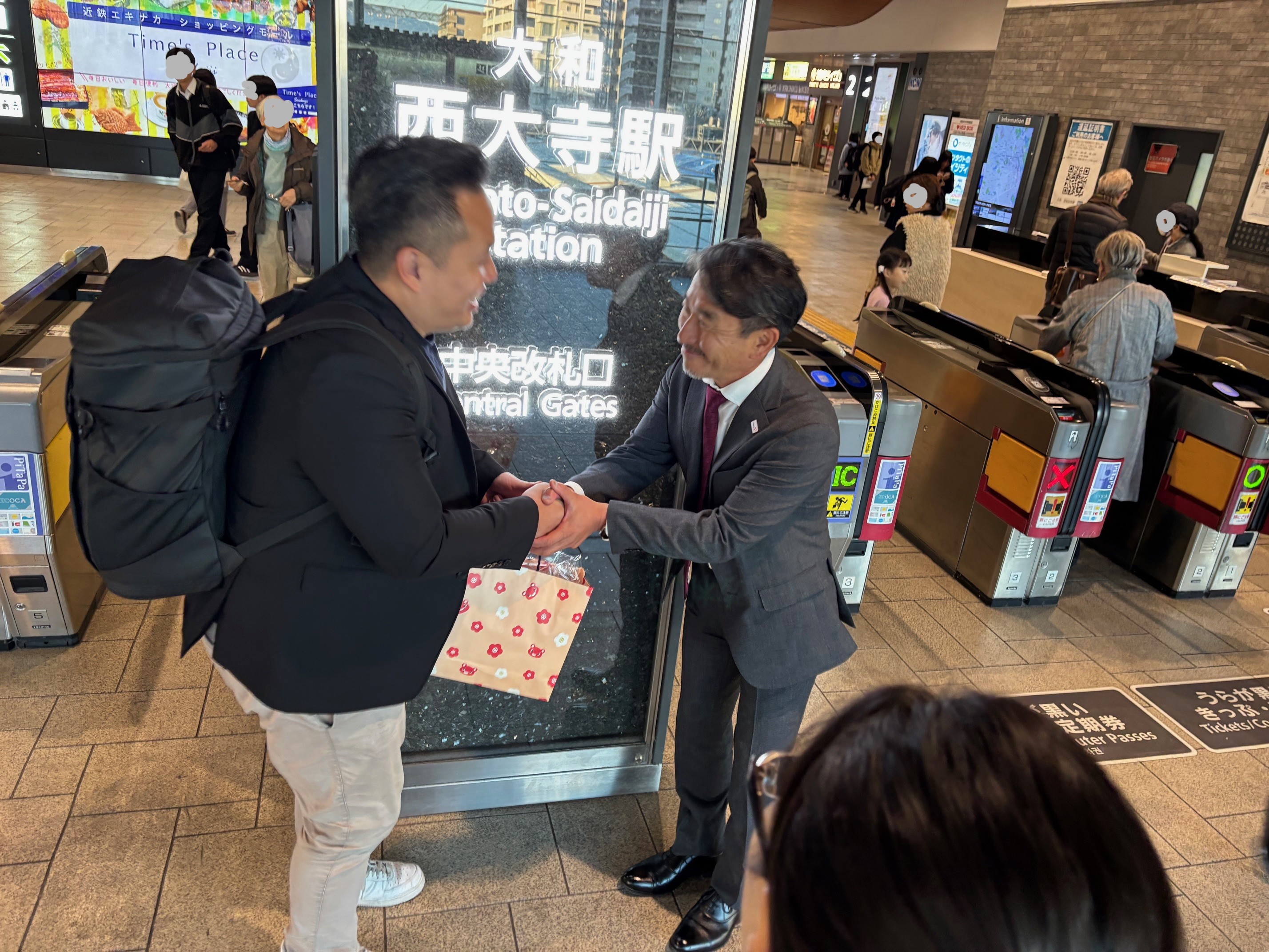 ↓西大寺駅で、お別れ。高雄YMCA総主事と奈良YMCA総主事と握手。